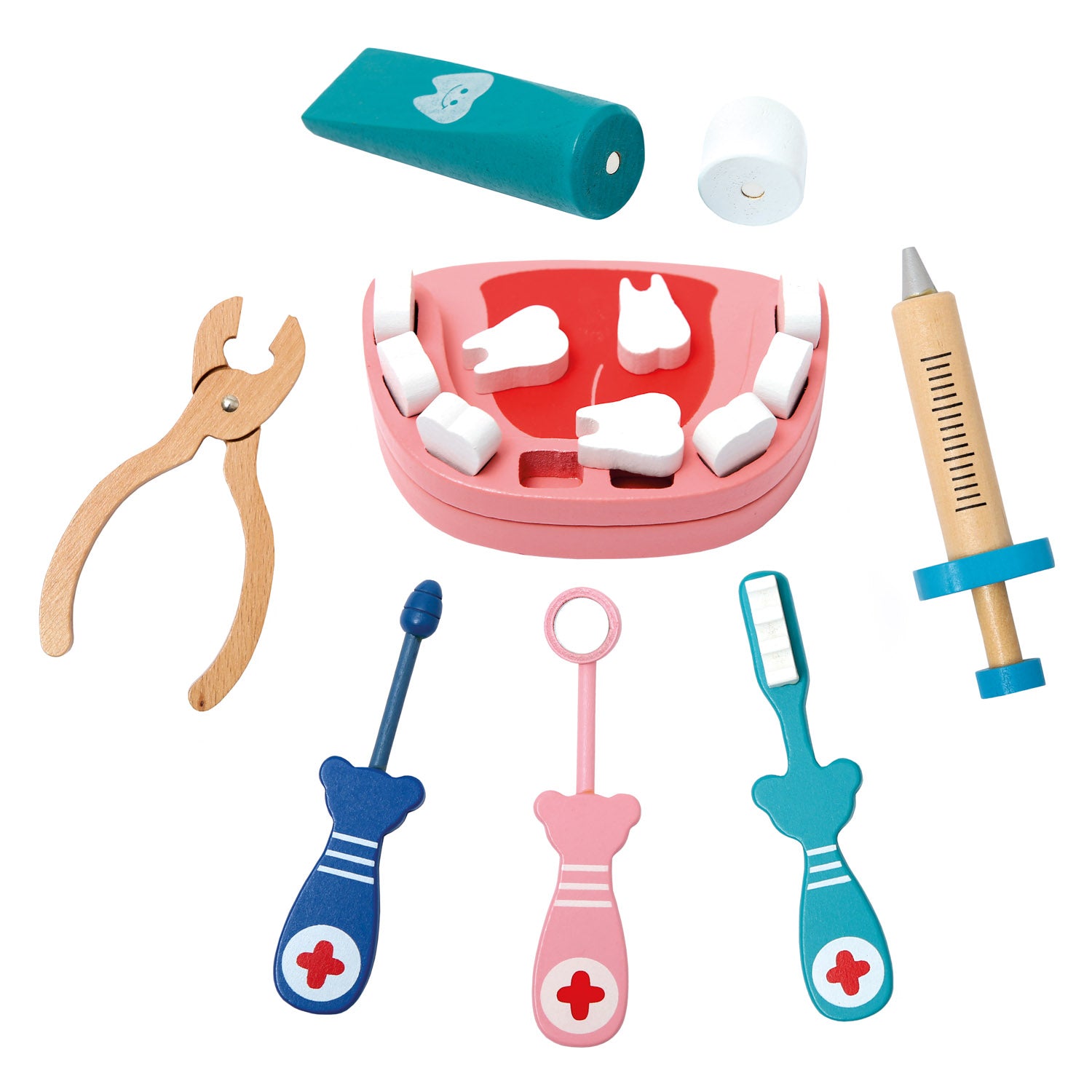 Dřevěná zubní sada pro malé zubaře. Dětský 10-ti dílný set v červeno-bílém pouzdře se zipem. Ideální pro hraní rolí, u kterých si děti skutečně dlouho vyhrají. Výběr nástrojů napomáhá zmenšit strach a obavy z návštěvy zubaře. Hravou formou tak trénují jazykové dovednosti, jemnou motoriku a podporují svou představivost. Všechny díly mají v kufříku své místo. Lze jej snadno sbalit a kamkoli vzít s sebou. Vhodné pro děti od 36 měsíců. Upozornění: Použití dětmi do 3 let pouze pod dohledem dospělé osoby. Rozměry kufříku: cca 24,5x15x8 cm.