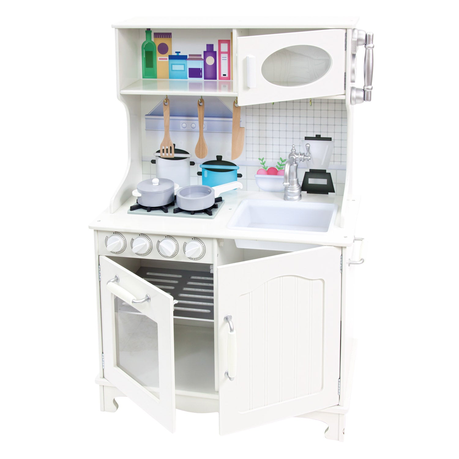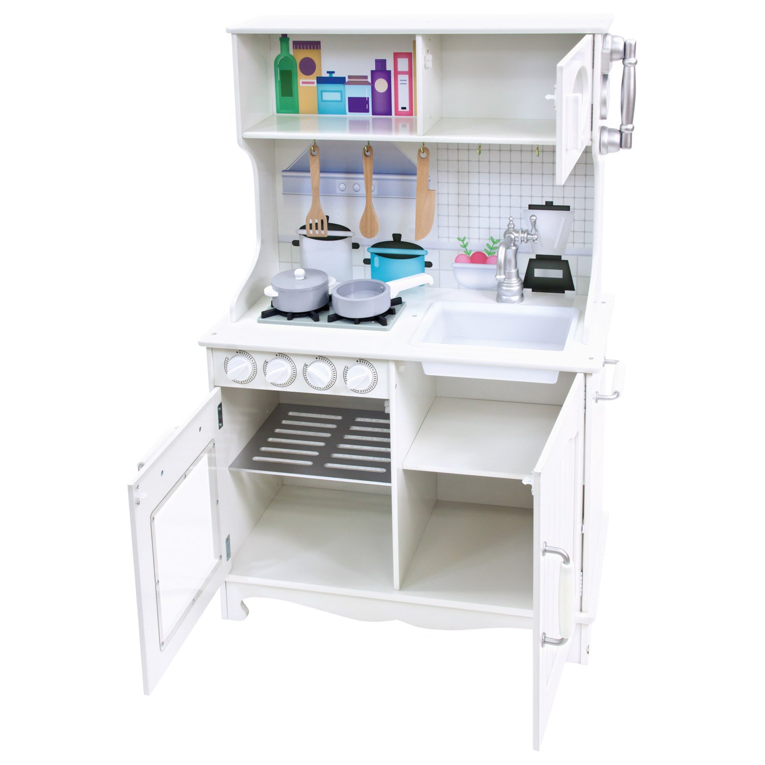 Das stilvolle und moderne Design in weißer Farbe, ergänzt durch tolle Funktionen wie Spüle, Mikrowelle und Kochfeld, bringt ein Gefühl von Authentizität und Spaß. Dank des hochwertigen und robusten Materials aus MDF, Kiefernholz und Kunststoff ist diese Küche strapazierfähig und garantiert lange haltbar.