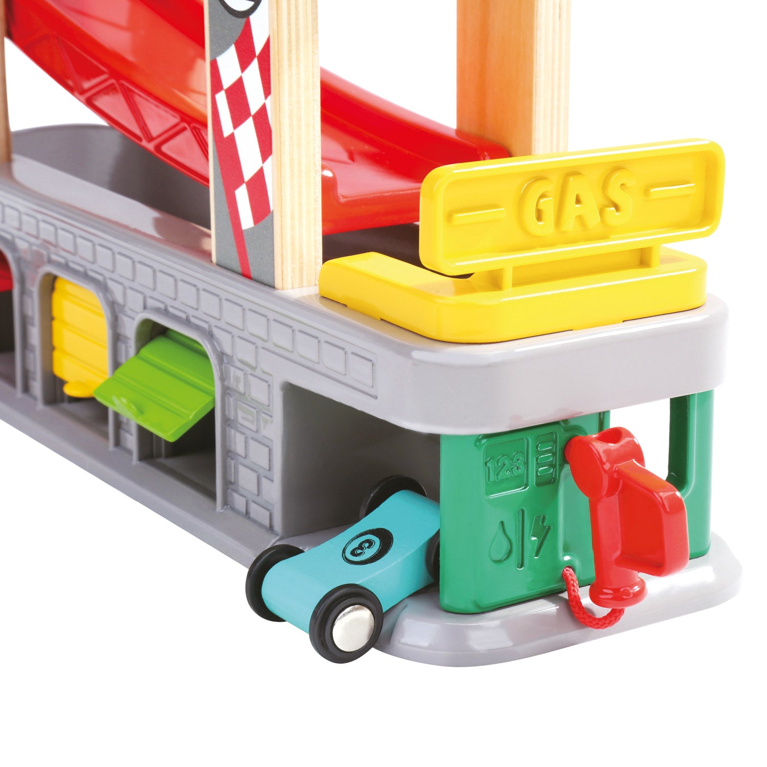 The car track with garage measures 9 x 33 x 34 cm and comes with four colourful wooden cars and matching garages with petrol pumps. The weight of this product is only 0.95 kg, making it easily portable and storable.