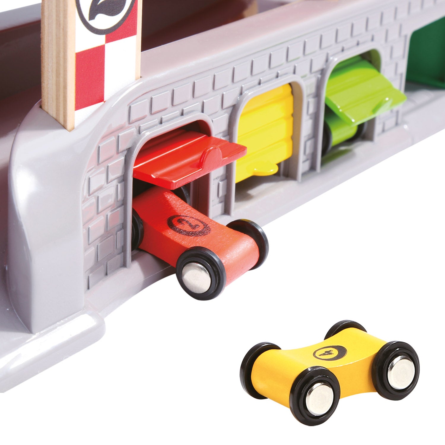 - Includes 4 colourful wooden cars and matching garages with petrol pumps.